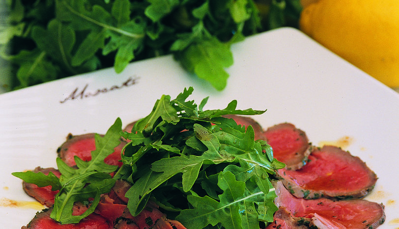 sığır eti dilimlerini servis tabağına, etlerin ortasında boşluk bırakarak yerleştirin. Yeşilliğe limon suyu ekleyip, tabağın ortasına yerleştirin. Kavrulmuş dolmalık fıstık, kurutulmuş kiraz domates ve pesto sosla süsleyerek servis yapın.