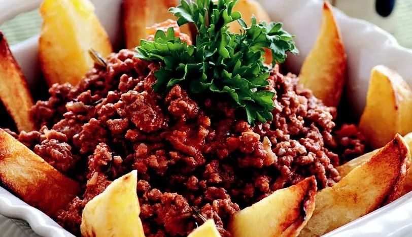 Patateslerin kabuklarını temizleyip elma dilimi şeklinde doğrayın. Tuzlayıp, zeytinyağında kızartın. Fazla yağını almak için kağıt havlu üzerine çıkarın. Kıymayı zeytinyağında rengi dönene dek soteleyin. Küp doğranmış soğan, ardından domates ekleyip sotelemeye devam edin. Tuz ve karabiberini ayarlayın. Patatesleri servis tabağına alın. Üzerine sotelenmiş kıymayı yayın. Kıyılmış maydanoz serpiştirip servis yapın.