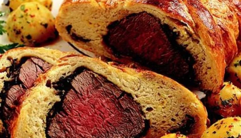 HAMURU hazırlamak için mayayı bir kaba alıp üzerine biraz su ekleyin. Unu geniş bir kaba alıp üzerine, su, tuz ve kabaran mayayı ilave edip yoğurun. Daha sonra yumurtaları birer biber hamura ekleyin ve yeniden yoğurun. Üzerini nemli bir bezle örtüp 1.5 saat dinlendirin. Diğer taraftan mantar sosu için mantar ve soğanı ince kıyın. Tereyağını bir tavaya alıp soğanı rengi dönene kadar kavurun. Üzerine mantar, tuz ve karabiber ilave edin. 10 dakika pişirip ocaktan alın. Geniş bir tencereye 2 çorba kaşığı tereyağı ve 3 çorba kaşığı zeytinyağını alın. Bonfileyi tencereye alın ve çevirerek her tarafını kızartın. Tuz ve karabiber ekleyip bir fırın kabına aktarın. Önceden ısıtılmış 260 derece fırında 20 dakika (tepside biriken suyu ara sıra üzerine gezdirerek) pişirin. Fırından alıp soğutun. Dinlenen hamuru 3'e bölün. Parçaların üzerine eritilmiş tereyağının paylaştırın ve yoğurarak yedirin. Hamur parçalarını birleştirip yeniden yoğurun. Üzerine nemli bir bez örterek 3 saat oda sıcaklığında dinlendirin. Etten daha büyük olacak şekilde açın. Kenarlarını kesip dikdörtgen şekline getirin. 2 adet yumurta sarısını çırpıp hamurun üzerine sürün. Eti hamurun ortasına yerleştirin. Mantar sosu etin üzerine gezdirin. Etin üzerini ve yanlarını hamurla kapatın. Fazlalıklarını bıçakla kesip düzeltin. Artan hamur parçalarını yeniden yoğurup uzun şeritler hazırlayın. Hamurun üzerini bu şeritlerle süsleyin. Kalan yumurta sarısını hamura sürün. Önceden ısıtılmış 200 derece fırında üzeri kızarana kadar pişirin. Patatesleri haşlayıp kabuklarını soyun. Tereyağını kızdırıp, ikiye
