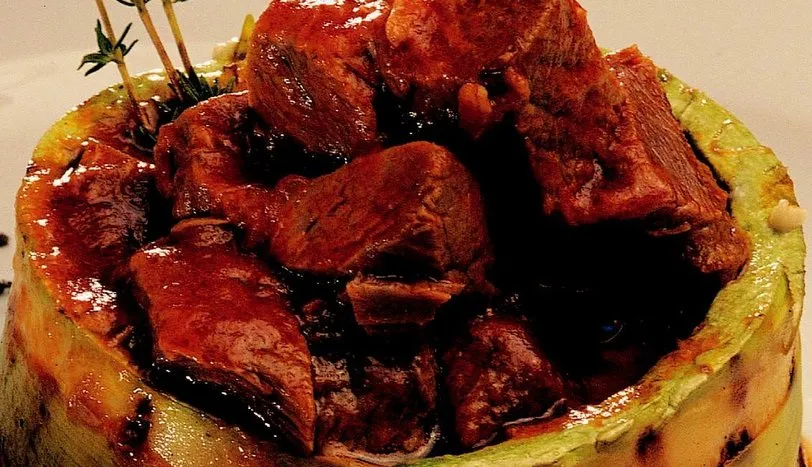 ÖNCELİKLE soğan, sarmısak ve salçayı et suyuna ekleyin. Eti ilave edip, pişmeye bırakın. Ayrı bir yerde patlıcanları çizip, ızgarada pişirin. Kabuklarını soyup çatalla ezin. 1 çorba kaşığı tereyağını, 1 çay bardağı krema ile çırpıp, patlıcan, şeker ve kaşar peynirini ilave edin. Küçük bir tavada hafifçe kaynatın. Tuz ve karabiber katın. Kabak dilimini ızgarada közleyin. Çember haline getirip, servis tabağının ortasına koyun. Onun da içine beğendiyi koyun. Üzerine eti ilave edip, kiraz domates ve taze kekik ile süsleyerek servis yapın.AŞÇININ NOTUDilerseniz kabağı, pırasa ya da taze soğan sapıyla bağlayabilirsiniz.