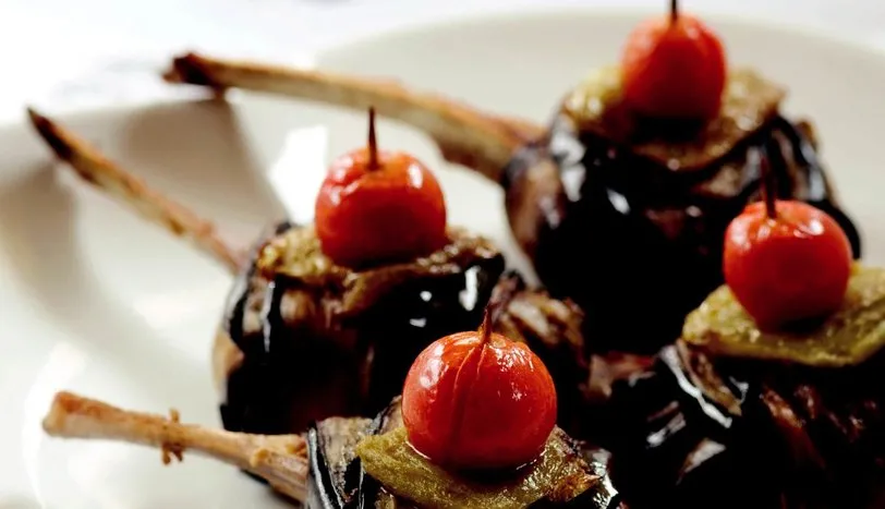 PATLICANLARI alacalı soyup, boydan boya uzunlamasına dilimleyin. Acısının çıkması için süt ve tuz katılmış suda 15 dakika bekletin. Suyunu süzdükten sonra kağıt havlu ile kurulayın ve kızdırılmış sıvıyağda önlü arkalı kızartın. Soğanı rendeleyin. Suyunu sıkın ve içine karabiber katın. Pirzolaları bu sosa bulayıp, 1-2 saat bekletin. Daha sonra suyu içinde kalacak şekilde tereyağında kızartın. İki adet kızarmış patlıcan dilimini çapraz şekilde koyun. Ortasına 1 adet pirzolayı yerleştirin ve açıkta kalan patlıcan uçları üst üste gelecek biçimde kapatın. Kürdan batırın ve ucuna kiraz domates takın. Malzemeler bitene kadar işleme devam edin. Fırın tepsisine yerleştirin ve önceden ısıtılmış fırında 15-20 dakika pişirip, sıcak olarak servis yapın.