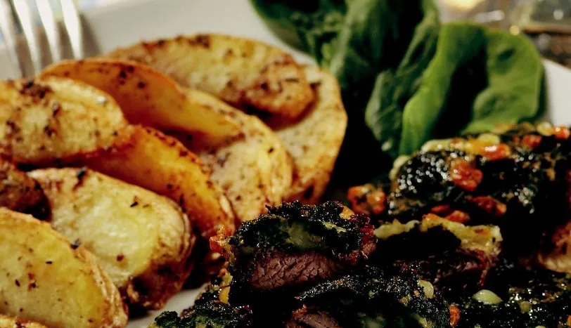 ISPANAKLARI haşlayın. Etlerin üzerine tuz ve karabiber serpin. Kızgın yağda etleri arkalı önlü kızartın. Etleri tavadan alıp yağlı kağıt serilmiş fırın tepsisine koyun. Haşlanmış ıspanakların suyunu süzüp avuç içinde sıkın ve ince ince kıyın. Üzerine ince kıyılmış dil peyniri, galeta unu, yumurta, tuz ve karabiberi katıp yoğurun. Ispanaklı karışımı etlerin üzerine sürün. Isıtılmış 220 derece fırında 15-20 dakika pişirin. Kızarmış patates ile servis yapın.