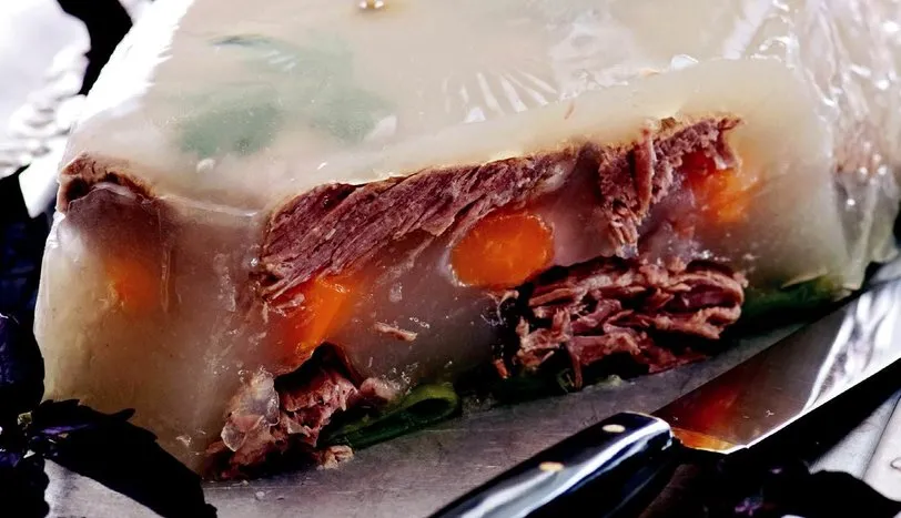 Eti tencereye alın. Defne yaprağı, 5 adet tane renkli biber ve etin üzerini geçecek kadar su ekleyip haşlayın. Et yumuşamaya başlayınca tuz ilave edin. İyice yumuşayınca ocaktan alıp soğumaya bırakın. Jöleyi et suyu ile pişirin. Dikdörtgen bir kalıba 1 çorba kepçesi jöle döküp, yaklaşık 3 dakika donması için dinlendirin. Üzerine maydanoz ve kalan 10 adet tane renkli biberi serpiştirin. Yeniden ince bir tabaka jöle dökün. 3 dakika daha dinlendirin. Etin yarısını koyup, yeniden jöle dökün ve dinlendirin. Havuç serpiştirip dökün. et parçalarını yerleştirin. Jöle döküp dinlendirin. Fasulye serpiştirip, son olarak jöle dökün. Buzdolabında 4-5 saat dinlendirin. Düz servis tabağına ters çevirip çıkarın. Reyhanla süsleyip servis yapın.