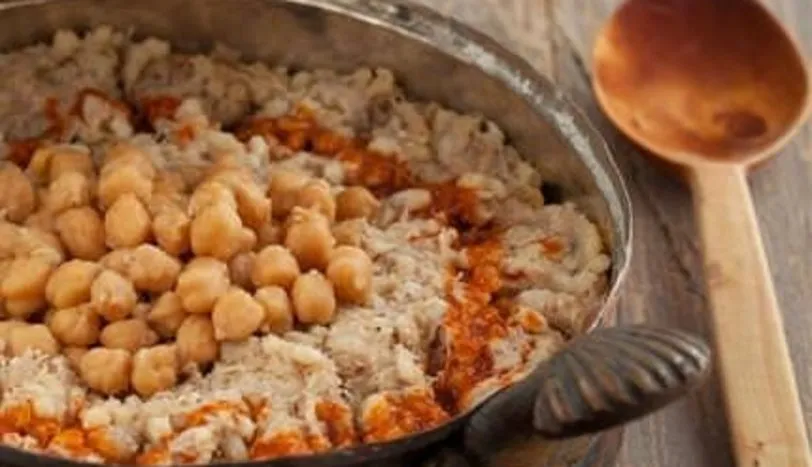 5. Küçük bir tavada kısık ateşte tereyağını eritin, buğdayın bulunduğu tencereye koyun, tuz, karabiber, kimyon ve tarçını serpin, güzelce karıştırın ve keşkeği bir servis tabağına koyun. Keşkeğin ortasını çukurlaştırın ve içine haşlanmış nohudu koyup servis yapın.