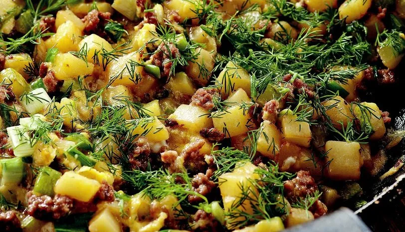 Küp doğranmış soğan ve sarımsağı tencereye alıp, zeytinyağında soteleyin. Kıyma ekleyip, suyunu salıp yeniden çekene dek karıştırarak pişirin. Kabuğu temizlenip küp doğranmış kabak ve patates ilave edin. Karıştırarak sebzeler yumuşayana dek pişirin. Tarçın ve karabiber serpiştirip, tuzunu ayarlayın.Teker teker yumurtaları ekleyip karıştırın. Üzerine kıyılmış dereotu serpip servis yapın.