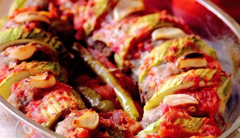 Kabakların bütünlüğünü bozmadan 1'er parmak kalınlığında verev dilimleyin. Kıyma, köfte harcı ve suyu karıştırıp yoğurun. Ceviz büyüklüğünde köfteler hazırlayın. Köfteleri, kabak dilimlerinin arasına yerleştirin (kabakların şekli yelpaze gibi olacak). Fırın kabını yağlayıp kabakları dizin. Küp doğradığınız domateslerikabak ve köftelerin üzerine yayın. Sarmısakları ikiye kesip en üste serpiştirin. Tuzunu ayarlayın. Sıvıyağ gezdirip, hiç su eklemeden üzerini alüminyum folyoyla kapatın. 150 derece fırında 1 saat pişirin.
