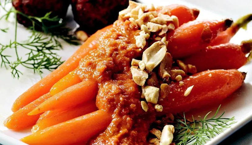 Köfteleri hazırlamak için, bayat ekmeğin kenarlarını alıp bir kaba koyun. Üzerine süt ekleyin ve 5 dakika bekletin. Daha sonra iyice sıkın. Kıymayı geniş bir kaba alın. Üzerine sütte bekletip sıktığınız bayat ekmek, rendelenmiş soğan, kekik, tuz ve karabiber ekleyip iyice yoğurun. Hazırladığınız harçtan arzunuza göre köfteler hazırlayın. 2 Sos için 1 su bardağı kabukları soyulmuş tuzlu yer fıstığını iyice dövün. Birtencereye alıp üzerine soya sosu, 2 çorba kaşığı toz şeker, biber salçası ve 1 su bardağı sıcak su ekleyin. 10 dakika kapağı açık olarak pişirin ve blenderden geçirip püre haline getirin. 3 Havuçları soyun. Yaprakları varsa birkaç tanesini üzerinde bırakın. Tereyağını bir tavada eritin. Havuçları tavaya alıp kapağını kapatın. Kısık ateşte 15 dakika ara sıra karıştırarak sote edin. Havuçları tavadan alın. Aynı tavaya kalan 1 çorba kaşığı toz şeker ve yarım su bardağı suyu koyup, koyulaşana dek kaynatın. Üzerine havuçları ekleyin. Tavayı sallayarak karıştırıp 5-10 dakika pişirin. 4 Hazırladığınız köfteleri kızgın yağda kızartın. Fazla yağını almakiçin kağıt havlu üzerine çıkarın. Birkaç dakika bekletip servis tabağına alın. Yanına sotelediğiniz havuçlarıkoyun. Üzerine yer fıstığı sosu gezdirin. Dövülmüş yer fıstığı serperek servis yapın.