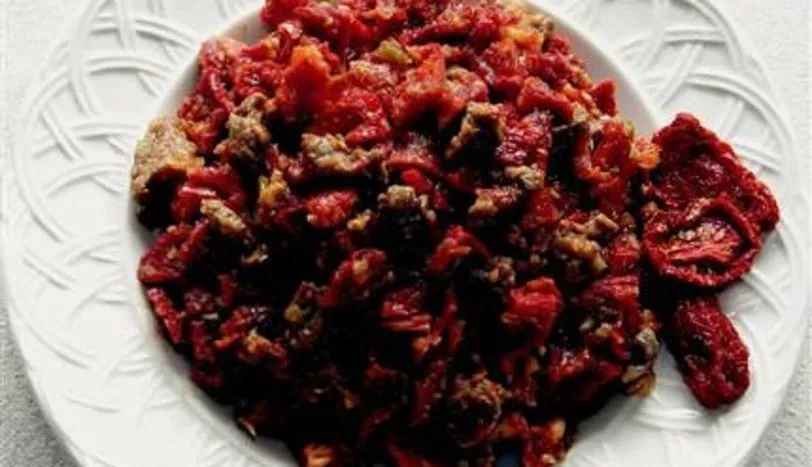 2 çorba kaşığı sıvıyağda, 250 gram kuşbaşı kuzu eti, 1 adet yemeklik doğranmış soğan ve 2 diş ince kıyılmış sarmısağı kavurun. İçine 1 adet ince kıyılmış sivri biber, 5 dakika sıcak suda bekletilmiş ve kuşbaşı doğranmış 250 gram kurutulmuş domates, tuz, karabiber ekleyip karıştırın. Yarım su bardağı sıcak su ilave edip kısık ateşte pişirin.