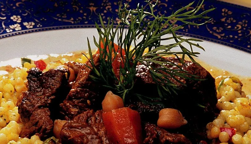 Kuskusu haşlayıp, kenara alın. Sıvıyağı tencereye koyun. Piyazlık doğranmış soğanı, sarmısağı ve eti ekleyip, soteleyin. Havucu, tüm baharatları, tuzu ve karabiberi de ilave edip kavurma işlemine 2 dakika daha devam edin. 2 su bardağı su ilave ederek et pişinceye kadar ağır ateşde kaynatın. Etin pişmesine yakın nohudu ilave ederek karıştırın. Sos için sarmısak, kırmızı biber, zeytinyağı ve ceviz içini bir blenderde püre haline getirin. Yahniyi kuskus ve sos ile servis yapın.