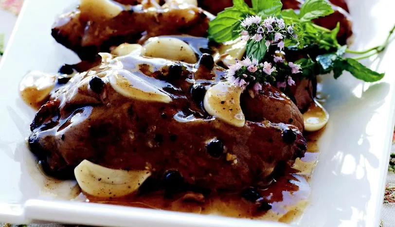 Külbastıları tuzlayıp, ızgarada önlü arkalı kızartın. Pişerken kurumalarını önlemek için üzerilerine fırçayla eritilmiş tereyağı sürün. Damla sakızını derin dondurucuda 5 dakika bekletin ve havanda iyice dövün. Eti yayvan bir tencereye alın. Üzerine et suyu, sarımsak, sirke, dövülmüş damla sakızı, karanfil, kimyon, tarçın, tuz ve karabiber ilave edin. Kısık ateşte et iyice yumuşayana dek (gerekirse üzerine su ekleyerek) pişirin ve ocağı kapatın. 10 dakika demlendirip servis yapın.