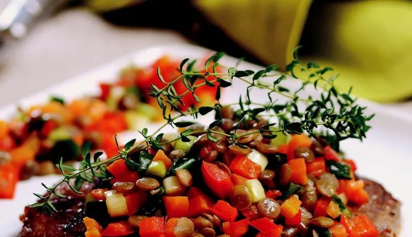 1ETİ geniş bir kaba alıp üzerine zeytinyağı, karabiber ve kekik ekleyip buzdolabında 2 saat marine edin. Diğer taraftan mercimeği haşlayıp süzün ve kenara alın. Havuç, kırmızı biber ve taze soğanı ince kıyın. Sıvıyağı kızdırıp havucu ve kırmızı biberi sote edin. Üzerine taze soğanı ilave edin. Soğanın rengi dönünce mercimek, karabiber, kekik ve tuz ekleyip ocaktan alın. 2Marine ettiğiniz antrikotları yapışmaz yüzeyli tavada önlü arkalı kızartıp servis tabağına alın. Mercimekli harcı üzerlerine paylaştırın. Taze kekikle süsleyerek servis yapın.