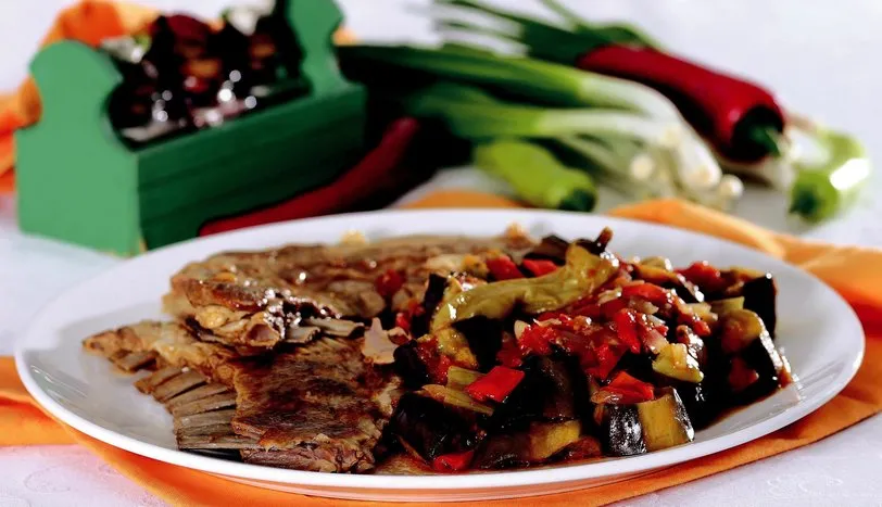 SIVIYAĞI bir tencerede kızdırın. Kaburgayı bütün olarak tencereye alıp harlı ateşte arkalı önlü kızartın. Patlıcanları alacalı şekilde soyup iri küpler halinde doğrayın. Acısının çıkması için tozşeker ve tuzlu suda 20 dakika bekletin. Kaburga kızardıktan sonra bir tabağa alın ve sıvıyağda iri doğranmış soğanı kavurun. Suyu sıkılmış patlıcanı ekleyip 1-2 dakika çevirin. Kıyılmış sivri ve kırmızı biber ile küp doğranmış domatesi ilave edin. 1-2 dakika tüm malzemeyi kavurduktan sonra bir tabağa alın. Aynı tencerenin dibine kaburgayı yerleştirin ve üzerine kavrulmuş sebzeleri koyun. Tuz, pulbiber ve suyunu ekleyip önce harlı ateşte, 10 dakika sonra kısık ateşte 15 dakika pişirin. Servis tabağına alıp sıcak olarak servis yapın.