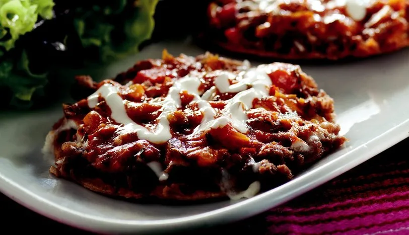 Tortilla'ları sıvı yağda kızartın. Ayrı bir yerde fasulye püresi, cheddar peyniri, sotelenmiş kıyma ve barbekü sosu iyice karıştırın. Karışımı tortilla'ların üzerilerine pay edin. Mevsim yeşillikleri ile servis yapın.