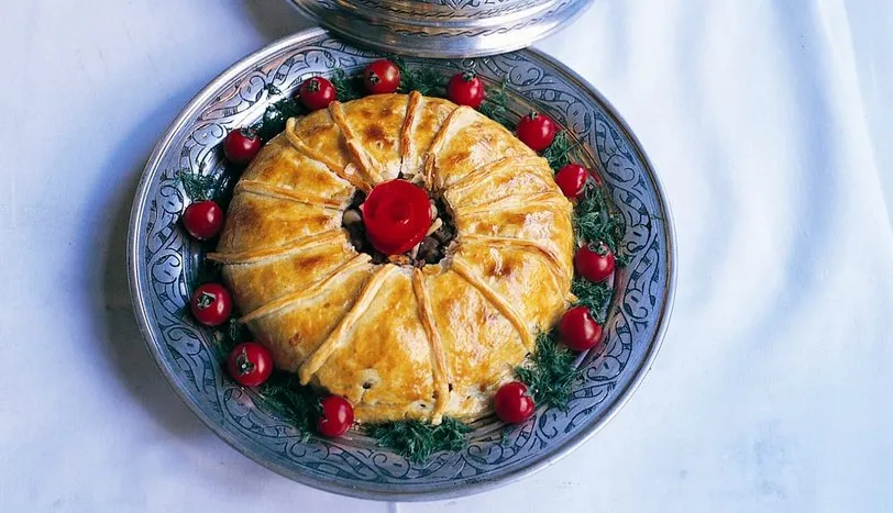 Etlerİ tencereye alın ve üzerine tuz serperek, suyunu salıp çekene kadar kapağı kapalı bir şekilde pişirin. Önce orta, sonra kısık ateşte, sürekli karıştırarak, etler iyice yumuşayana kadar kavurun. Ayrı bir tabağa alın. Etleri pişirdiğiniz tencereye arpacık soğanları ve sarmısakları ilave edip, 3-4 dakika kavurun. Domatesleri soyup, sivri biberleri küçükçe doğrayın. Kavrulan soğanlara ekleyin. Eti ve baharatları ekleyip kavurun. Ateşten alın. Pilavı hazırlamaya başlayın. Pirinci tereyağında kavurun. Havucu küp küp doğrayın. Rendelenmiş havuç, tarçın, kuş üzümü, su ve tuzu ekleyip, kısık ateşte kapağı kapalı olarak pişirin. Milföy hamurunu yarım cm'den biraz ince açın. Hamuru, dibi yuvarlak bir tencerenin içine, hamurları kenarları dışarı sarkacak şekilde yerleştirin. İçine pilavı doldurun. Sarkan hamurları pilavın üzerine kapatın. Tencereyi fırın tepsisine ters çevirin. Üzerine çırpılmış yumurta sürün. Önceden ısıtılmış 180 derece fırında kızartın.