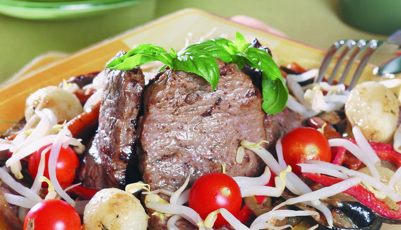 Tavaya aldığınız 1 kahve fincanı sıvıyağı kızdırıp, etleri arkalı önlü kızartın. Kızarmış etleri servis tabağına alın. Soya filizini 3 dakika haşlayıp süzün. Etleri kızarttığınız yağın üzerine, kalan sıvıyağı ilave edin. Kabukları soyulmuş arpacık soğanları hafif pembeleşene kadar kavurun. Kibrit çöpü şeklinde (jülyen) doğranmış havuç, patlıcan, kırmızı ve sivri biberleri katarak kavurmaya devam edin. ince kıyılmış sarmısak ve fesleğen, krema, tuz, kekik ekleyip 2 dakika daha kavurun. Etlerin üzerine sote edilmiş sebzeleri yerleştirip sıcak olarak servis yapın.