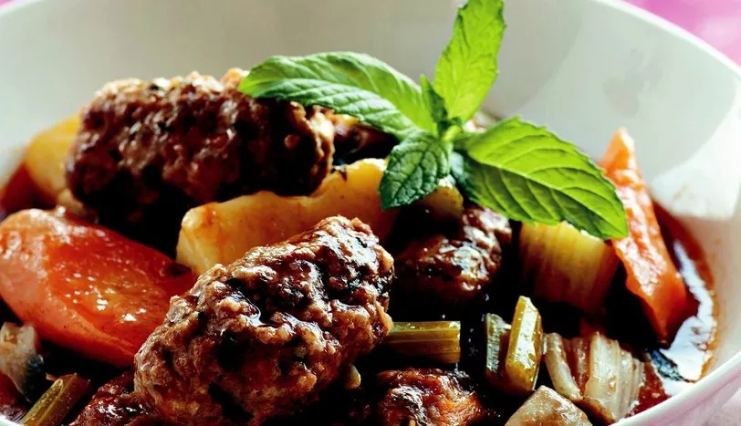 Köfte için kıymayı bir kaba alın. Üzerine rendelenmiş soğan, ıslatılıp suyu sıkılmış ekmek içi, kıyılmışmaydanoz, su, tuz ve baharatları ekleyip, yoğurun. Harçtan arzunuza göre köfteler hazırlayın. Patatesleri elma dilimi, havuçları verev, kereviz saplarını küp doğrayın. Mantarları dörde bölün. 2 Tereyağını bir tencereye alıp, iri doğranmış soğanı rengi dönene dek sote edin. Üzerine patatesi ekleyip birkaç dakikaçevirin. Ardından havuç ve kerevizi katıp birlikte birkaç dakika daha sote edin. Mantarı ekleyin ve 5 dakika pişirin. Salçayı katıp kavurduktan sonra tencereye sebzelerin üzerini geçecek kadar su ekleyin. Kaynamayabaşlayınca köfteleri tencereye ilave edin. Tuzunu ayarlayın. 25-30 dakika pişirip ocaktan alın.