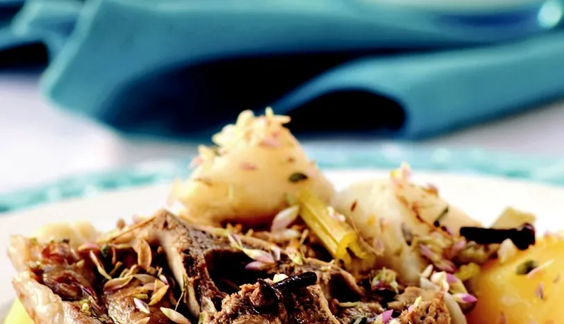 KUZU gerdanı iyice yıkadıktan sonra tencereye alın. Üzerini geçecek kadar su ekleyip, yarı yarıya yumuşayana kadar pişirin. Kereviz, patates ve havucun kabuklarını soyun. İri küpler şeklinde doğrayıp, kereviz sapıyla birlikte tencereye ilave edin. Sarmısak, dörde bölünmüş soğan, çubuk tarçın, karanfil, tuz ve karabiberi ekleyin. Suyu azalmışsa 1 çay bardağı sıcak su ekleyin. Daha sonra sebzeler ve et iyice yumuşayana kadar pişirin. Çubuk tarçını tencereden alın ve sıcak olarak servis yapın.