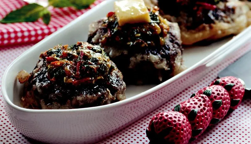 4 Sebze harcı için kabağı rendeleyin ve sıkarak suyunu alın. Derin bir kaba aldığınız kabağın üzerine, rendelenmiş havuç ve jülyen doğranmış kırmızı biber katın. Rendelediğiniz patatesin suyunu sıkarak alın ve kabağın üzerine ekleyin. Yumurta, un, tulum peyniri veya rendelenmiş eski kaşar peyniri, maydanoz, dereotu, nane, tuz ve karabiber katın. Tüm malzemeyi karıştırın. Sebzeli harcı, köftelerin ortasına paylaştırın. Önceden ısıtılmış 200 derece fırında üzerileri kızarana kadar pişirin ve sıcak olarak servis yapın.