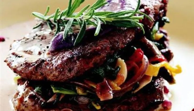 Bonfile, beyazbiber, karabiber, kekik, sarmısak ve zeytinyağını harmanlayın. Üzerini örtüp, 2-3 saat buzdolabında marine edin. Sebzeli harç için yarım ay doğranmış soğan, jülyen doğranmış sarı ve kırmızı biberi zeytinyağında ve orta ateşte 4-5 dakika karıştırarak soteleyin. Dilimlenmiş mantar ekleyip, mantar suyunu salıp yeniden çekene dek, yaklaşık 3-4 dakika soteleyin. Kıyılmış ıspanak ilave edip, ıspanağın rengi dönene dek kavurun. Kıyılmış sarmısak ve fesleğen ekleyip karıştırın. Tuz ve karabiberini ayarlayıp ocaktan alın. Sos için yapışmaz yüzeyli tavada soğan, kenarlarından çizik atılmış sarmısak ve zeytinyağını orta ateşte 2 dakika kavurun. Defne yaprağı ve fesleğen ilave edip karıştırın. Kremayı ekleyin. Tuz ve karabiberini ayarlayıp, karıştırarak 2 dakika pişirin. Bonfileleri kızgın yapışmaz yüzeyli tavada önlü arkalı pişirin. İki bonfilenin arasına harçtan koyup servis tabağına yerleştirin. Kalan bonfile ve harcı da aynı şekilde hazırlayın. Üzerlerine sos gezdirip dilediğiniz şekilde süsleyin. Sıcak olarak servis yapın.