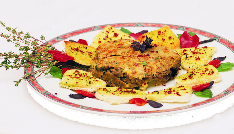 HAŞLANMIŞ patatesleri soyup rendeleyin. İçine 1 çay kaşığı tuz, ince kıyılmış maydanoz, kırmızıbiber, karabiber, yarım su bardağı rendelenmiş kaşar peyniri ilave edip yoğurun. Yağlanmış fırın tepsisine eşit şekilde yayın. Diğer tarafta patlıcanları alacalı soyup 1 cm kalınlığında dilimleyin. Tuzlayıp 15-20 dakika beklettikten sonra yıkayıp kurulayın. Teflon tavada az yağda arkalı önlü kızartın. Tepsiye yaydığınız patates püresinin üzerine bir sıra halinde dizin. Derin bir kabın içinde kıyma, tuz, karabiber, kimyon, yenibahar, bir tutam reyhan, 1 adet yumurta, soğan, çok ince doğranmış sivri biber, ince doğranmış domates, galeta ununu iyice yoğurun. Bu harcı da tepsideki diğer malzemenin üzerine yayın. Üzerine yumurta sarısı sürüp önceden ısıtılmış 200 derece fırında 15-20 dakika pişirin. Fırından çıkartmadan önce kalan kaşar peynirini üzerine serpin. Üzeri kızarana kadar pişirin. Fırından aldığınız yemeği dilimledikten sonra iki dilimi üst üste yerleştirerek servis yapın.