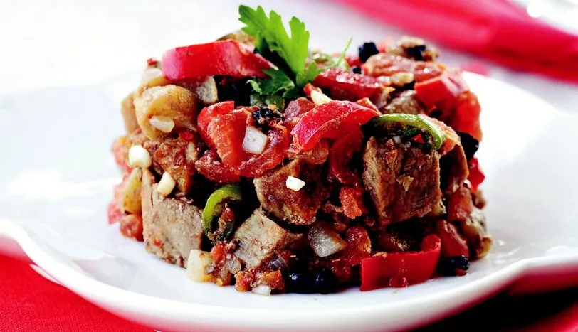 Eti suyunu salıp, çekene kadar kısık ateşte pişirin. Ayrı bir tencerede kıyılmış soğanı zeytinyağında kavurun. İçine halka doğranmış sivri biber ve kırmızıbiber ilave edin. Kısık ateşte 1-2 dakika çevirdikten sonra et, tarçın, sıcak suda 10 dakika bekletip, süzdüğünüz kuş üzümü ve kabukları soyulup küp doğranmış domatesi katın. 2 dakika daha bu şeklide pişirdikten sonra tencereyi ocaktan alın ve baharatlarını ilave edin. Karıştırdıktan sonra sıcak olarak servis yapın.