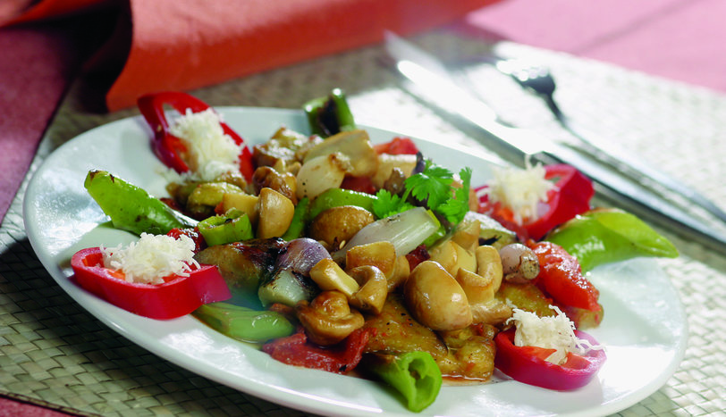MantarlarI ortadan ikiye kesip 2 çorba kaşığı zeytinyağında 1-2 kez soteleyin. Patlıcanları, arpacık soğanları, domatesleri ve sivri biberleri közleyin. Közlediğiniz sebzelerin kabuklarını soyduktan sonra iri iri doğrayın ve malzemelerin hepsini karıştırın. Mantarları da bu karışıma ilave edin ve servis tabağına alın. Süslemek için kırmızı biberi halka halka doğrayın. Ortasına rendelenmiş kaşar peyniri koyup, etrafına maydanoz serperek servis yapın.