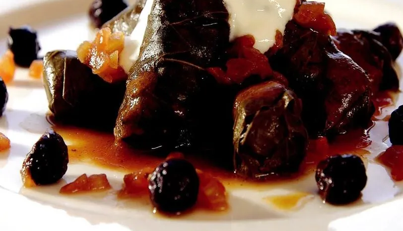 SOĞANI incecik doğrayıp tuzla ovun. Üzerine kıyma ve baharatları ekleyin. İyice yoğurup pirinç, nane ve dereotu ilave edin. Üzerine çok az miktarda su ekleyerek yumuşak bir iç harç hazırlayın. Asma yapraklarını suda bekletip tuzunu alın. Yapraklara hazırladığınız harçtan koyup sarın. Tencerenin tabanına birkaç tane asma yaprağı koyup sarmaları dizin. Üzerine kuru vişne serpin. Bir sıra daha sarma dizip yeniden vişne yerleştirin. Sarmalar bitene kadar aynı işlemi sürdürün. Daha sonra sarmaların üzerine tereyağı ve üzerini geçecek kadar sıcak su ekleyin. Ocağa oturtup ağır ateşte 1 saat pişmeye bırakın. Ayrı bir yerde tüm terbiye malzemesini çırpın. Sarmanın suyundan bir kepçeyi üzerine ekleyip karıştırın. Yemeği ocaktan indirmeden hemen önce terbiyeyi azar azar üzerine gezdirin. Tencereyi sallayarak karışmasını sağlayın. Bir taşım kaynatıp ocaktan alın. Yoğurtla birlikte ikram edin.