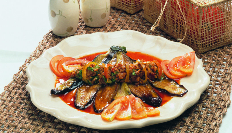 PATLICANLARI alacalı soyup, kalınlıklarına göre yelpaze şeklinde 4'e veya 5'e keselim. Yelpaze patlıcanları tuzlu suda yarım saat kadar bekletelim. Sonra yıkayıp kurulayalım. Kızdırılmış sıvıyağda, arkalı önlü kızartalım. 1 Kızaran patlıcanları, yayvan bir tencereye alalım. Bir kapta, 1 çorba kaşığı salçayı 1 su bardağı su ile inceltip, patlıcanların üzerine gezdirelim. Tuzunu ve karabiberini ekleyip 15-20 dakika pişirelim. Bu arada tavaya 4 çorba kaşığı sıvıyağı alalım. Küp doğranmış soğan ve sarmısakları ekleyip, pembeleştirelim. 2 Kıymayı ekleyip 2-3 dakika daha kavuralım. Kalan yarım çorba kaşığı salçayı, tuzu, karabiberi ve kimyonu ekleyip birkaç kez çevirelim. Kalan yarım su bardağı suyu ekleyip kıymalı sosu 10-15 dakika pişirelim. 3 Patlıcanları servis tabağına alıp, ortasına kıymalı harcı uzunlamasına düzgünce yayalım. 4 Üzerini dilediğimiz şekilde, arzuya göre haşlanmış ve şeritler halinde kesilmiş kırmızı biberlerle süsleyelim. Domatesleri dilimler halinde kesip, servis tabaklarına yerleştirelim ve servis yapalım.