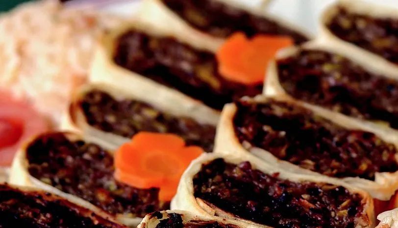 Yumurtanın akını ve sarısını ayırın. Yumurta akı, yufka ve fıstık hariç tüm malzemeyi robottan geçirin. Harcı bir kaba alıp fıstığı ekleyin ve iyice yoğurun. Yufkaları düz bir zemine üst üste yayıp içine harcı paylaştırdıktan sonra rulo haline getirin. Yaptığınız ruloların uçlarına çırptığınız yumurta aklarını sürüp yapıştırın ve buzdolabında bir gün dinlendirin. Daha sonra dilimleyip şişlere dizin ve ızgarada arkalı önlü kızartıp servis yapın.AŞÇININ NOTUKöfte hazırlamak için, malzemelerinizi evde robottan geçirmek yerine içine yumurta eklemeden, kasapta kıyma makinesinde bir kez çektirebilirsiniz.