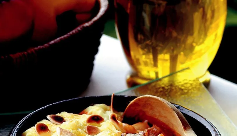 ZEYTİNYAĞI ve tereyağını bir tencereye alıp kızdırın. Kuşbaşı doğranmış etleri tencereye alın. Etler bıraktığı suyu çekip pembe bir renk alıncaya kadar 8-10 dakika kadar kavurun. Yemeklik doğranmış soğanı ekleyip 2 dakika kadar daha kavurun. Dörde bölünmüş mantar, yemeklik doğranmış renkli biber ve domates ekleyip karıştırın. Biber salçasını ekleyip biraz daha kavurduktan sonra un ekleyin. Baharat, tuz ve suyu ekleyip 20-25 dakika kaynatarak pişirin. Kızarmış bademleri tencereye ekleyip karıştırın. Yemeği servis yapılacak güveçlere paylaştırın. Patates püresi için patateslerin kabuklarını soyup küp küp doğrayın. Bir tencereye alıp üzerini geçecek kadar su koyup haşlayın. Suyunu süzüp ezin. Bir tencerede tereyağını eritip patates püresini ekleyin. İyice karıştırdıktan sonra üzerine sıcak süt ve tuz ekleyin. Dibini tutturmamak için karıştırıp tencereyi ocaktan alın. Püreyi sıkma torbasına alın. Güveçlerin üzerini patates püresi ile kaplayın. Üzerine fırçayla yumurta sarısı sürüp badem serpiştirin. Önceden ısıtılmış 200 derece fırında üzeri kızaran kadar pişirin ve sıcak olarak servis yapın.