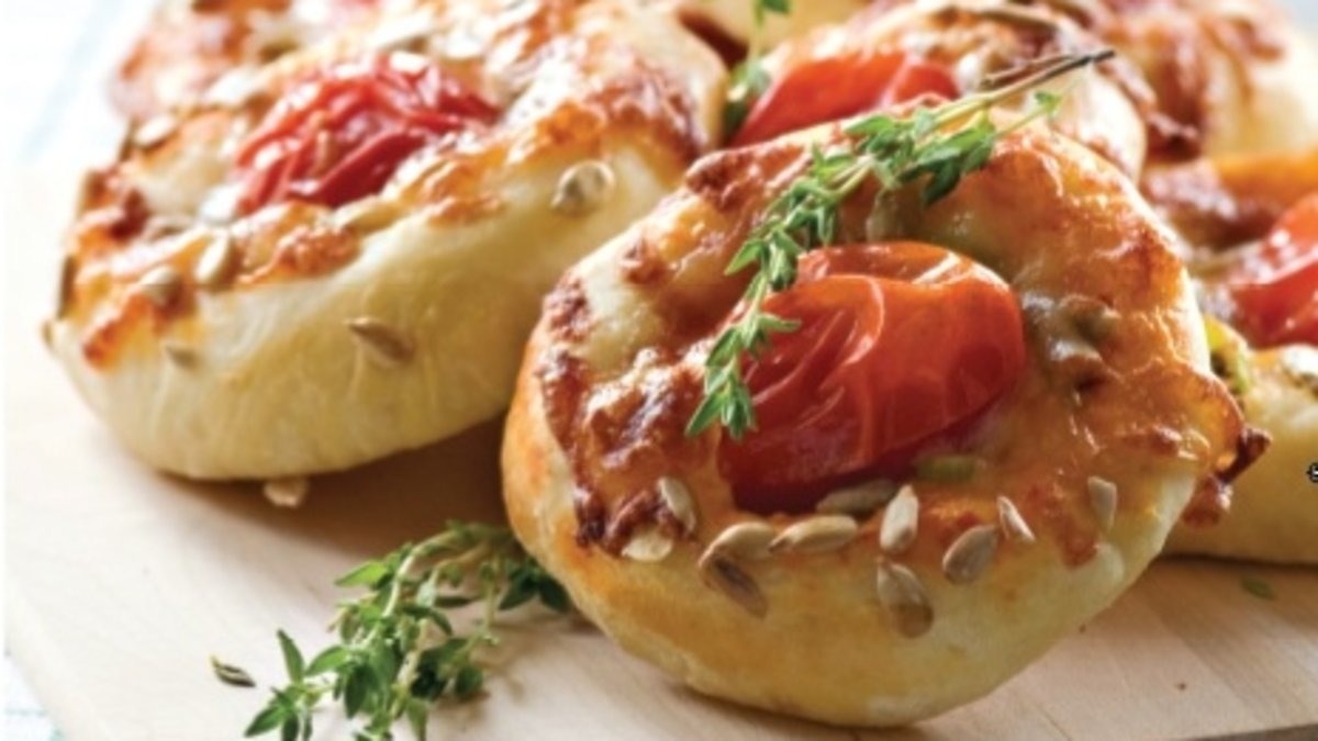 1 parça hamuru elinizle yuvarlayıp, fırın tepsisine yerleştirin. Parmağınızla ortasını çukurlaştırıp, kenarlarını yüksek bırakın ve diğer hamurları da aynı şekilde hazırlayın. Üzerlerine fırça yardımıyla salça sürüp, kıyılmış sivri biber serpin ve ortadan ikiye kesilmiş kiraz domatesleri yerleştirin. Rendelenmiş kaşar peynirini serpin.