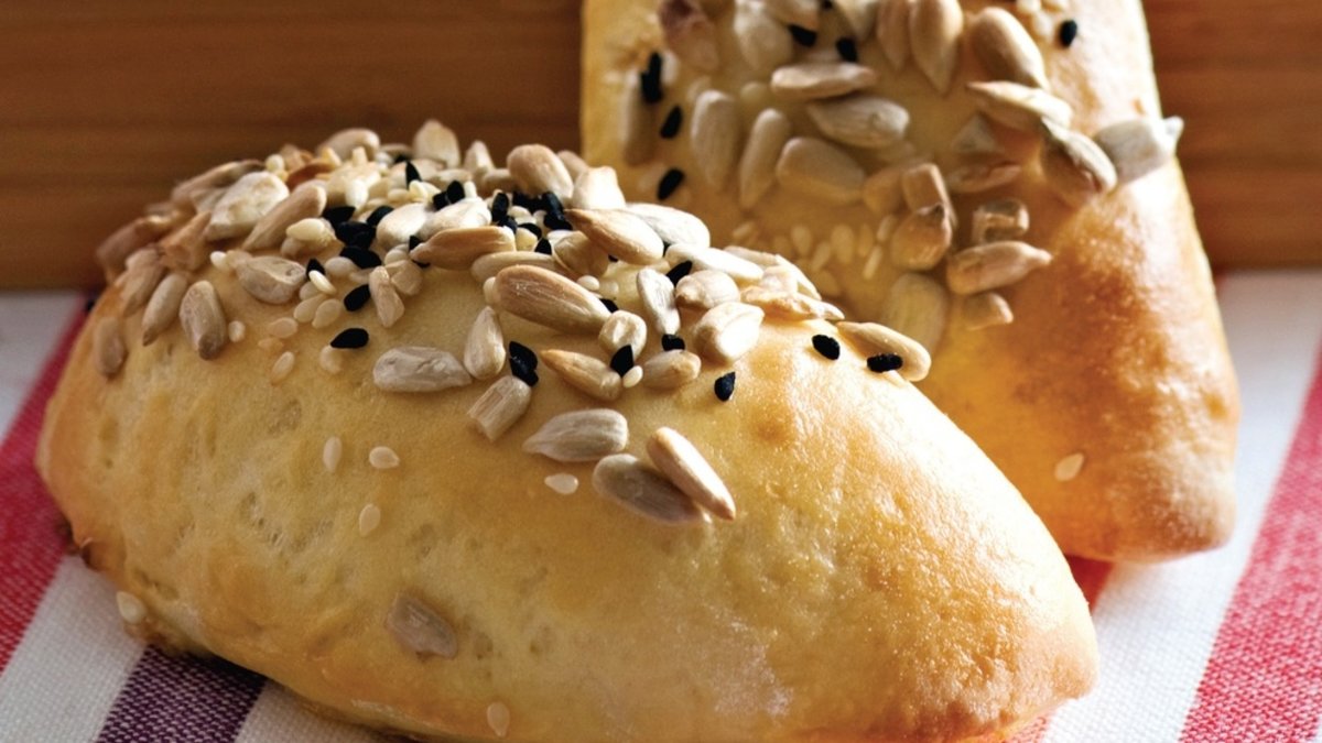 İçi için ay çekirdeği, rendelenmiş beyaz peynir, siyah zeytin, kaşar peyniri, kıyılmış kırmızı biber, maydanoz, dereotu ve pul biberi derin bir kabın içinde karıştırın. Kestiğiniz hamur parçalarının bir kenarına hazırladığınız harçtan 1 tatlı kaşığı koyun ve diğer ucu üzerine kapatıp, yarım ay şekli verin. Hamur ve iç harç bitene kadar işleme devam edin. Yağlanmış fırın tepsisine yerleştirin ve üzerine yumurta sarısı sürün. Ay çekirdeği, çörek otu ve susam serpin. Önceden ısıtılmış 200 derece fırında 30-35 dakika pişirin.