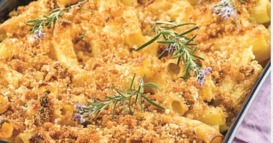 Makarnayı haşlamak için su ve tuzu tencereye alıp kaynatın. Makarna ekleyip 8 dakika haşlayın ve dişe gelecek kıvamda iken ocaktan alarak suyunu süzün. Geniş bir tavada tereyağını eritip, unu ekleyin. Birkaç dakika kavurduktan sonra süt, tuz, karabiber ve kremayı ekleyip pişirmeye devam edin. Peynir ekleyip eriyene kadar karıştırın. Haşlanmış bezelye ve pastırmayı katıp karıştırdıktan sonra ocaktan alın. Makarna ekleyip harmanlayın. Orta boy bir fırın kabını 1 tatlı kaşığı zeytinyağı ile yağlayıp, makarnayı içine boşaltın. Üzeri için zeytinyağı, galeta unu ve sarımsağı karıştırın ve makarnanın üzerine yayın. Önceden ısıtılmış 180 derece fırında 15 dakika pişirin. Sıcak servis yapın.