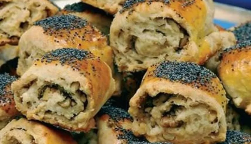 Oda sıcaklığında bekletilmiş margarini yumurta akı ile karıştırın. Zeytinyağı ve yoğurt ilave edin. Elenmiş un ve kabartma tozunu koyup karıştırın. Yumuşak bir hamur elde edin. Hamuru iki parçaya ayırın. Her bir parçayı yarım cm kalınlığında açın. Açılmış yufkaların üzerine dövülmüş ceviz serpin. Yufkaları rulo yapın, iki parmak kalınlığında şeritler kesin. Yağlanmış fırın tepsisine dizin. Üzerlerine yumurta sarısı sürüp, haşhaş tohumu serpin. Önceden ısıtılmış 170 derece fırında üzerileri pembeleşene kadar pişirin.