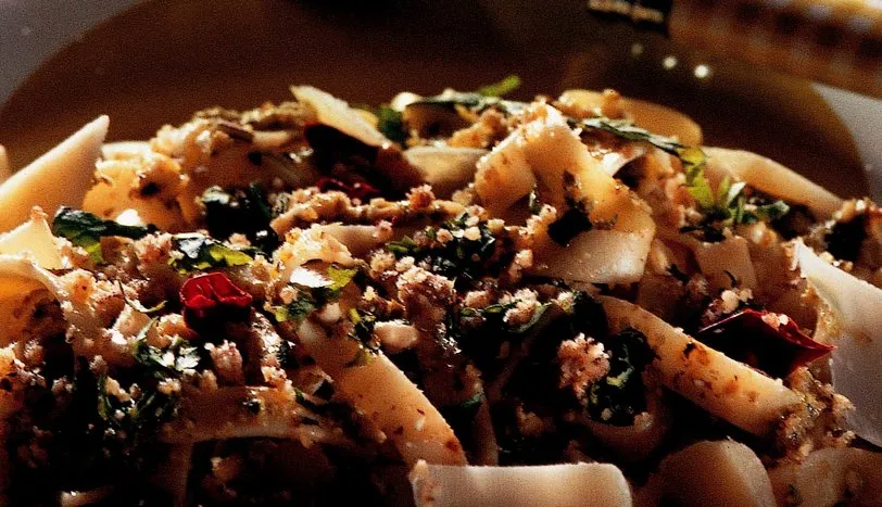 Makarnayı üzerindeki tarife göre haşlayın. Suyunu iyice süzün. Pesto sosu, dövülmüş cevizi ve zeytinyağını bir tavaya aktarın. 2-3 dakika kısık ateşte pişirin. Tagliatellenin üzerine ekleyip, harmanlayın. Üzerine küçük kesilmiş acı biberleri serpin. Dilerseniz üzerine çok ince dilimlenmiş parmesan peyniri serperek, servis yapın.
