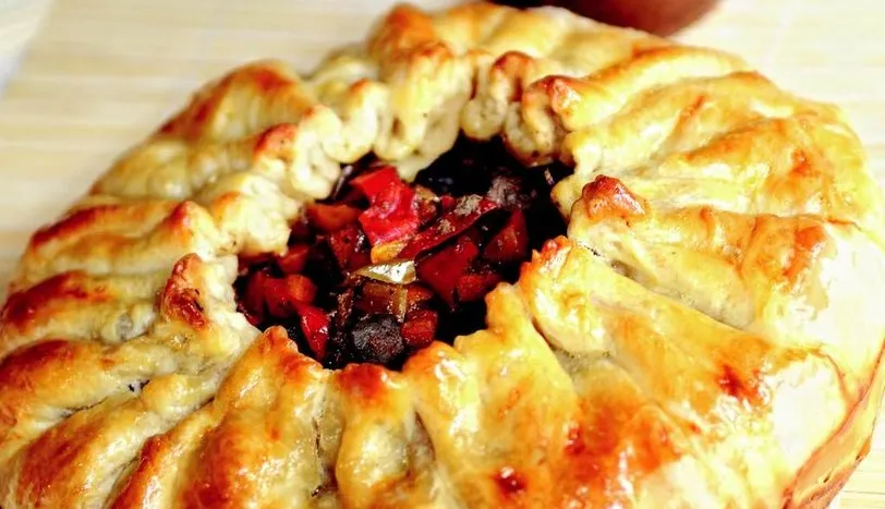 Ciğeri iyice yıkadıktan sonra zarını soyun ve kuşbaşı doğrayın. Yapışmaz yüzeyli bir tavaya aldığınız yağda ciğeri kavurun. Piyazlık doğranmış soğanı ekleyin ve kavurmaya devam edin. Soğan pembeleşmeye başlayınca, zar şeklinde doğranmış biberleri ekleyin. 5 dakika daha kavurduktan sonra ocağın altını kapatın. Tuz, karabiber ve pul biber serpip, kıyılmış maydanoz ekledikten sonra soğuması için bir kenara alın. Diğer yandan hamur için 2 su bardağı unu yoğurma kabına alın ve ortasını havuz şeklinde açın. Yumurta, yağ, süt, limon suyu ve tuz ilave edip, tüm malzemeyi yoğurun. Hamurun üzerini nemli bir bezle örtün ve 15 dakika dinlendirin. Daha sonra 10 eşit bezeye ayırın. Her bezenin üzerine un serperek yemek tabağı büyüklüğünde açın. Daha sonra yufkaların üzerine eritilmiş margarin sürerek üst üste koyun. Elinizi yağlayarak hamuru 40 cm çapında olacak şekilde açın. Ortasına hazırladığınız ciğerli iç harcı yerleştirin. Üzerini orta kısım açıkta kalacak biçimde şekilli olarak kapatın. Yağlanmış fırın tepsisine yerleştirin ve üzerine yumurta sarısı sürün. Önceden ısıtılmış 180 derece fırında üzeri kızarana kadar pişirin. Dilimleyerek sıcak olarak servis yapın.