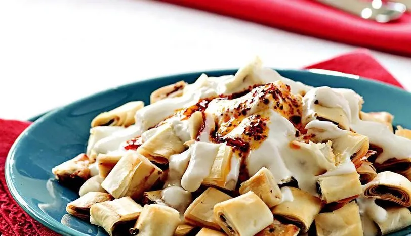 HARÇ için kıyma, rendelenmiş soğan, kıyılmış maydanoz, yumurta akı, tuz ve karabiberi iyice karıştırıp, kenara alın. İki adet yufkayı üst üste koyup, kenarını 2 cm katlayın ve harçtan 2 çorba kaşığı yerleştirin. Yufkayı rulo şeklinde sarıp, küçük küpler halinde kesin. Kalan yufkaları da aynı şekilde hazırlayın. Mantıları yağlanmış fırın tepsisine dizin. Önceden ısıtılmış 180 derece fırında pembeleşene dek pişirip, servis tabağı alın. Üzerine sarmsaklı yoğurdu dökün. Tereyağında yakılmış pulbiber gezdirip, nane serpiştirin ve servis yapın.