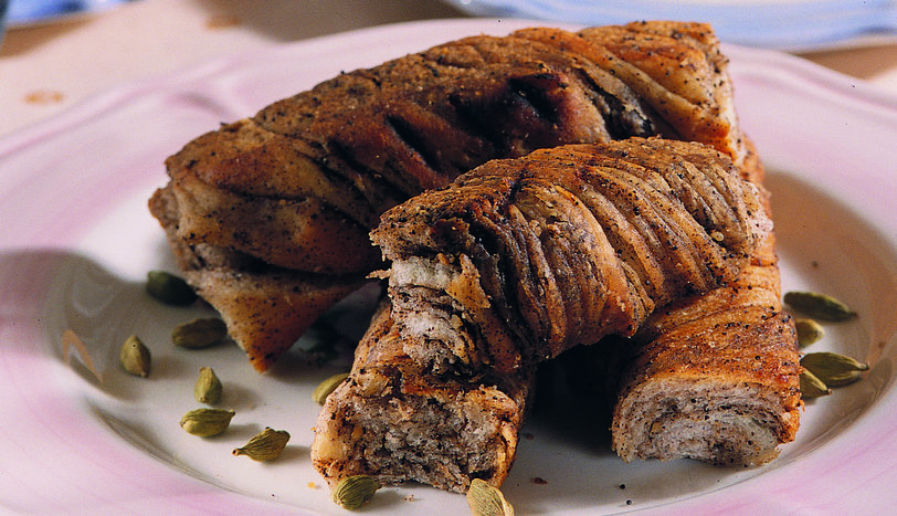 Ilık suyun içine, toz şeker ve mayayı ekleyip karıştıralım. Unun ortasını havuz gibi açarak, kabaran mayayı ilave edelim. Tuzunu ayarlayıp özlü bir hamur yoğuralım. Hamur kabının ağzını örterek, ılık bir ortamda iki misli kabarmasını bekleyelim. Bu arada sıvı yağın içine haşhaşı, iri dövülmüş cevizi ilave edip karıştıralım. Mayalanan hamurdan eşit büyüklükte 10 adet yuvarlak beze yapalım. Bezelerin her birini unlanmış bir zeminde elimizle veya merdane yardımıyla servis tabağı büyüklüğünde açalım. 1 Açılan her bezenin üzerine haşhaşlı karışımdan sürerek 10 adet hamuru üst üste dizelim. 2 En üstteki hamurun üzerine de kalan haşhaşlı karışımı sürüp, rulo yaparak saralım. Hamur rulosunu, 10 cm'lik aralıklarla keselim. Kestiğimiz her hamur parçasını ip büker gibi iki ucundan ters yönlerde burarak, yağlanmış fırın kabına dizelim. Çörekleri, ısıtılmış 200 derece fırında, altı üstü pembeleşene dek pişirelim.