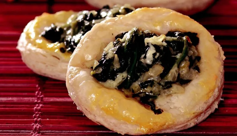 Milföy hamurlarından bir su bardağının ağzı ile daireler çıkartın. Çıkan dairelerin yarısının da ortalarını çay bardağı ile kesin. Alta bir büyük daireyi koyup kenarlarına yumurta akı sürün. Üzerine ortası kesik daireyi yerleştirip kenarlarına da yumurta sarısı sürün. Diğer milföyleri de aynı şekilde hazırlayın. Önceden ısıtılmış 175 derece fırında 10-15 dakika pişirin. Diğer taraftan soğanı margarinde kavurun. İnce kıyılmış ıspanak, beyaz peynir, pastırma, tuz, pul biber ve karabiber ekleyip kavurmaya devam edin. Fırından çıkardığınız volovanların içine ıspanaklı harçtan paylaştırıp tekrar sıcak fırına verin. 5 dakika pişirdikten sonra sıcak servis yapın.
