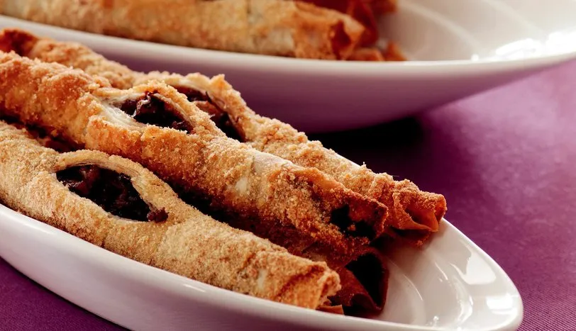 Küp doğranmış soğanı sıvıyağda soteleyin. Kıyma ekleyip, suyunu salıp yeniden çekene dek kavurun. Ocaktan alıp, tuzunu ayarlayın. Ceviz, kıyılmış maydanoz ve karabiber ilave edip soğumaya bırakın. Bir adet yufkayı düz bir zemine yayın. Zeytinyağı ve suyu karıştırıp, yufkanın üzerine sürün. Üçgen olacak şekilde 12 eşit parçaya bölün. Kalan yufkalara da aynı işlemi uygulayın. Yufka parçalarının geniş taraflarına harç yerleştirip, kenarlarını toparlamadan rulo şeklinde sarın. Üzerlerine kalan zeytinyağlı su karışımını sürün. Galeta ununa bulayıp, yağlı kağıtla kaplanmış fırın tepsisine yerleştirin. Bıçak yardımıyla ortalarına enlemesine çizik atın. Önceden ısıtılmış 180 derece fırında, hafif kızarana dek pişirin.