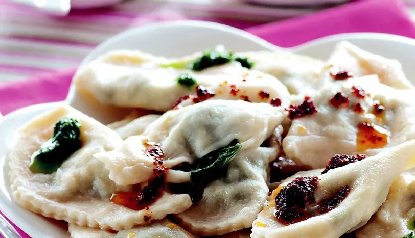 UNU geniş bir kaba alıp, ortasını havuz gibi açın. Kefir, yumurta, süt ve tuz ekleyip, yumuşak kıvamlı bir hamur elde edene dek yoğurun. Oda sıcaklığında 15 dakika dinlendirin. Hamuru merdane yardımıyla mantı hamuru kalınlığında açın. Su bardağının ağzı ile yuvarlaklar çıkarın. Harç için kıyılmış ıspanak, peynir, karabiber ve tuzu karıştırın. Bir adet hamuru düz bir zemine yerleştirin. Harçtan bir çorba kaşığı alıp, hamurun bir kenarına koyun. Diğer kenarı üzerine kapatın. Hamur ve harç bitene dek işlemi tekrarlayın. Ravioli'yi kaynayan tuzlu suya atın. Hamurlar suyun üzerine çıkmaya başladığında süzgeç yardımıyla servis tabağına alın. Üzerine kızdırılmış tereyağı gezdirip servis yapın.