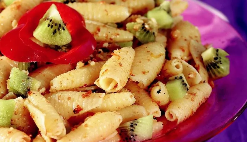 Makarnayı sıvıyağ ve tuz eklediğiniz suda 7-8 dakika haşlayın. Süzüp geniş bir kaseye alın. Diğer taraftan tereyağını eritip, badem ve cevizi hafifçe kavurun. Üzerine rendelenmiş limon kabuğu, krema, soyulup küp doğranmış kivi, tuz ve karabiber ekleyin. Hafifçe karıştırıp ocaktan alın. Hazırladığınız sosu makarnanın üzerine gezdirip harmanlayın ve sıcak servis yapın.