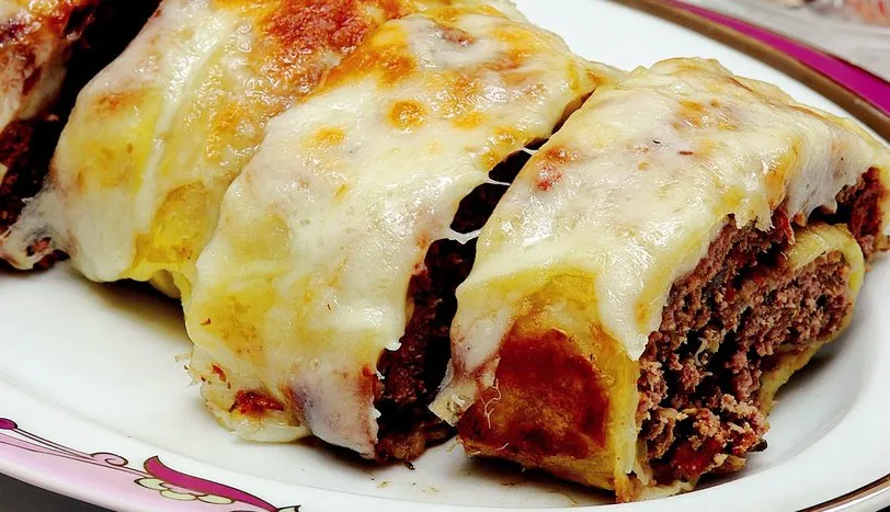 Margarini eritip ılıtın. Yoğurt ve yumurtayı birlikte çırpıp margarini ekleyip karıştırın. Fırın tepsisini yağlayın. Yufkalardan birincisini tepsiye yayın. Üzerine hazırladığınız karışımdan sürün. İkinci ve üçüncü yufkaya da aynı işlemi uygulayın. Tepsinin kenarlarından artan yufkaları tepsinin içine alın. İç malzemesi için domates, soğan, taze soğan ve sivri biberleri ince doğrayın. Kıyma ve baharatları ekleyip iyice karıştırın. İç malzemeyi yufkaların üzerine yayın. Önceden ısıtılmış 170 derece fırında 20 dakika pişirin. Tepsiyi fırından çıkardıktan sonra üzerini alüminyum folyo ile kapatıp havlu ile sarın. Ilınınca rulo şeklinde sarın. İki parmak genişliğinde dilimleyip üzerine rendelenmiş kaşar peyniri serpin. Kaşarlar eriyene kadar tekrar fırınlayın. Sıcak olarak servis yapın.