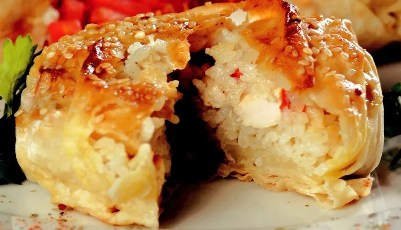 İlk olarak pirinci sıcak tuzlu suda yarım saat bekletip süzün. Dolmalık fıstıkları tereyağında pembeleşene kadar kavurun. Üzerine 2 bardak soğuk suyu koyup kaynatın. Suya pirinci ekleyin. Kısık ateşte, pirinç suyunu çekince dinlenmeye bırakın. Harç için tavukları haşlayıp küp doğrayın. Küp doğranmış domates, ince kıyılmış biber, soğan ve sarımsağı ekleyin. Tuz ve karabiberini ayarlayın. Bir tavada zeytinyağı ile birlikte, kısık ateşte 5 dakika kavurun. Hazırladığınız bu harcı pilavın içine koyarak karıştırın. Diğer taraftan yufkaları ikiye bölün. Ortalarına hazırladığınız pilavlı harçtan koyarak bohça şeklinde katlayın ve ters çevirin. Üzerlerine çırpılmış yumurta sarısı sürüp susam serpin. Önceden ısıtılmış 175 derece fırında yufkaların üzeri kızarana kadar pişirin. Sıcak olarak servis yapın.