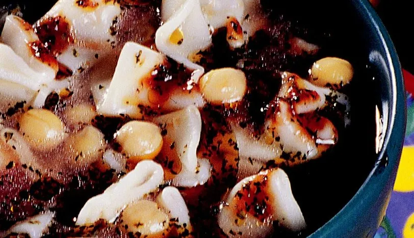 AKŞAMDAN ıslattığınız nohutların üzerine 2 su bardağı su ekleyerek haşlayın. Hamuru hazırlamak için unun ortasını havuz gibi açıp yumurta, tuz ve 3 çorba kaşığı su ilave edip yoğurun. Üzerine nemli bir bez örterek 15 dakika dinlendirin. Bir kaba aldığınız kıymanın üzerine ince kıyılmış soğan, maydanoz, tuz ve karabiber ilave edip karıştırın. Dinlendirdiğiniz hamuru unlu zeminde 1 mm kalınlığında açın. 1 cm'lik kareler halinde kesip içlerine harç koyun. Kareleri dört köşesinden birleştirerek kapatın. Tuz ve sıvıyağ eklediğiniz suya mantıları atın. Yumuşamalarına yakın nohutları ekleyin. Birkaç dakika birlikte pişirdikten sonra ocaktan alın. Küçük bir tavada tereyağını eritip salçayı kavurun. Nane ve limon suyunu da ekleyin. Bir-iki çevirip ocaktan alın ve çorbanın üzerine gezdirip servis yapın.