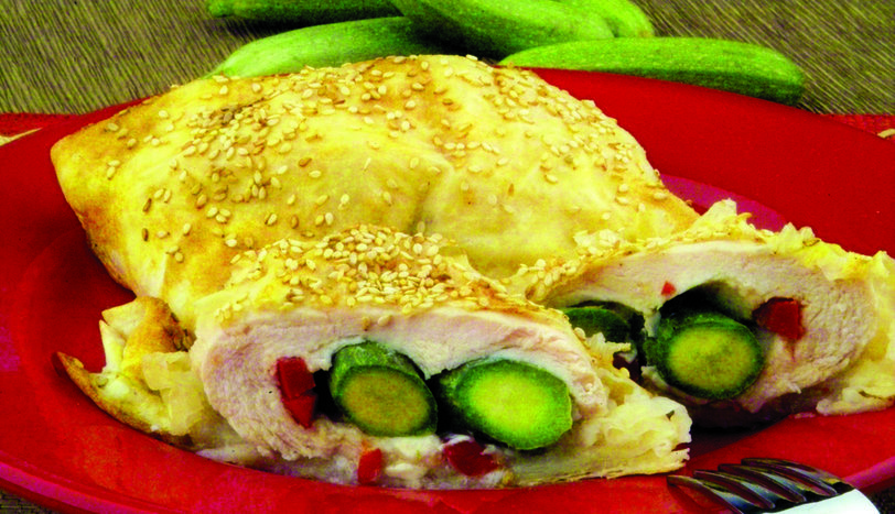 Tavuk göğüslerini et döveceği havan tokmağı ile döverek iyice inceltin. Üzerlerine minik kabakları (kabuklarını soymadan) ve iri doğranmış biberleri yerleştirin. Soya sosunu paylaştırın. Tavuk göğüslerini rulo şeklinde sarın. 1 adet yufkayı ortadan ikiye bölün. Yufkalarla da tavukları bohça şeklinde sarın. Üzerine yumurta sarısı sürüp, susam serpin. 250 derece fırında, üzeri kızarana dek pişirin. Dilimleyerek servis yapın.