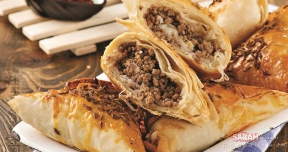 Yufkalardan birini düz bir zemine serip eşit genişlikte 8 uzun şerit halinde kesin. Şeritleri bir fırça yardımı ile yağlayın. Şeritlerden birinin uç kısmına bir yemek kaşığı kıymalı harç koyun. Bir sağa bir sola doğru çevirerek üçgen şeklinde katlayın. Açılmasını önlemek için ucuna su sürün.