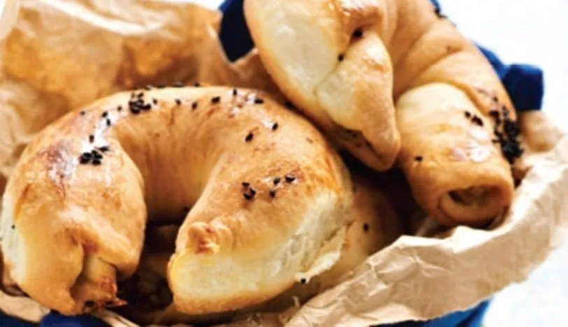 Harç için soğanı kıyıp zeytinyağında soteleyin. Rendelenmiş patates, peynir, nane, karabiber, kimyon ve tuz ekleyip karıştırın. 2 Hamur için unu yoğurma kabına alıp, ortasını havuz gibi açın. Yaş maya, yumurta akı, süt, sıvı yağ, tereyağı ve tuz ekleyip yoğurun. Hamuru 12 bezeye ayırıp, merdane yardımıyla pasta tabağı ebadında açın. Ortalarına harcı pay edip, önce rulo şeklinde sarın. Sonra uçlarını birleştirip ay şekli verin. Yağlanmış fırın tepsisine yerleştirip, üzerlerine çırpılmış yumurta sarısı sürün. Çörek otu serpip, önceden ısıtılmış 180 derece fırında, üzerleri kızarana dek pişirin. Ilık olarak servis yapın.