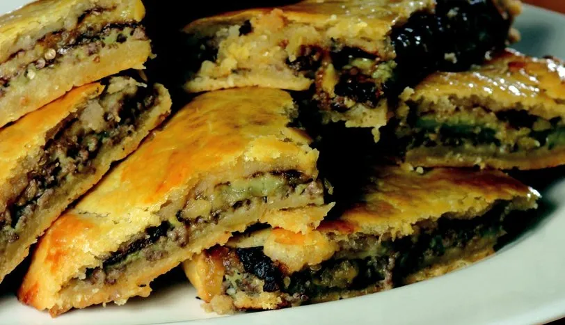 Hamuru hazırlamak için, küllü suyu, domates suyu ile birlikte bir tencerede kaynatın (Domates suyu hazır olabileceği gibi, 2 adet domatesin kabuklarını çıkartıp blenderden geçirerek de yapılabilir). Tereyağı ve zeytinyağını bu karışıma ekleyin. Unu, sürekli karıştırarak, kaşık kaşık ilave edin. Tuz ekleyip, hamur kaşığa yapışmayacak bir kıvama gelinceye kadar sürekli karıştırarak pişirin. Ateşten alıp hamuru soğutun. Daha sonra buzdolabına koyup, yarım saat bekletin. Dolaptan alıp yoğurun ve ikiye ayırın. Hamurun yarısını, yağlamış olduğunuz fırın tepsisine bir parmak kalınlığında yayın. İç malzemeyi hazırlamak için, patlıcanları yıkayıp közleyin. Kabuklarını soyup, kararmasını önlemek için limonlu suda bekletin. Soğuyunca elinizle sıkıp, sudan çıkartın. Kıymayı küçük bir tavada 1 çorba kaşığı margarin ile kavurun. Patlıcanları kıymaya ekleyip, çatalla ezin. Üzerine yumurta, tuz ve karabiber ilave edin. Hazırladığınız harcı hamurun üzerine yayın. Ayırdığınız ikinci parça hamuru yağlı kağıt üstünde açıp, kıymalı harcın üzerine kapatın. 1 adet yumurtayı çırpıp, fırça yardımı ile pidenin üzerine sürün. Önceden ısıtılmış 200 derece fırında 30-35 dakika pişirip, sıcakken servis yapın.