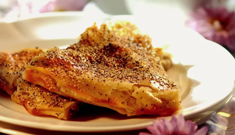 Derin bir kaseye unu alın ve ortasını havuz şeklinde açın. Su ve 1 çimdik tuz ilave edip yoğurun. Hazırladığınız hamuru 2 eşit parçaya ayırın. Her bir parçayı servis tabağı büyüklüğünde açın. Açılan hamurların üzerini eritilmiş tereyağı ile bolca yağlayın. Bir bıçak yardımıyla hamurun kenarlarından ortaya doğru sigara böreğindeki gibi üçgen olacak şekilde 8 yerinden çizik atın. Bu üçgen kısımları hamurun ortasına doğru katlayın. Diğer hamura da aynı işlemi uygulayın. Üzerlerini streç filmle kapatıp buzdolabında 1 saat bekletin. Patlıcanları közleyip, kabuklarını soyun ve bir çatalla ezin. Rendelenmiş kaşar peyniri, yumurta, tuz ve karabiber ekleyip karıştırın. Buzdolabından çıkardığınız hamurları unlu bir zeminde tekrar servis tabağı büyüklüğünde açın. Önce birinci hamuru orta büyüklükte yağlanmış fırın kabının içine yayın. Üzerine patlıcanlı harcı boşaltın ve ikinci hamuru yayın. Yumurta sarısı ve eritilmiş tereyağını karıştırıp üzerine sürün. Önceden ısıtılmış 180 derece fırında 25-30 dakika pişirin. Sıcakken dilimleyerek
